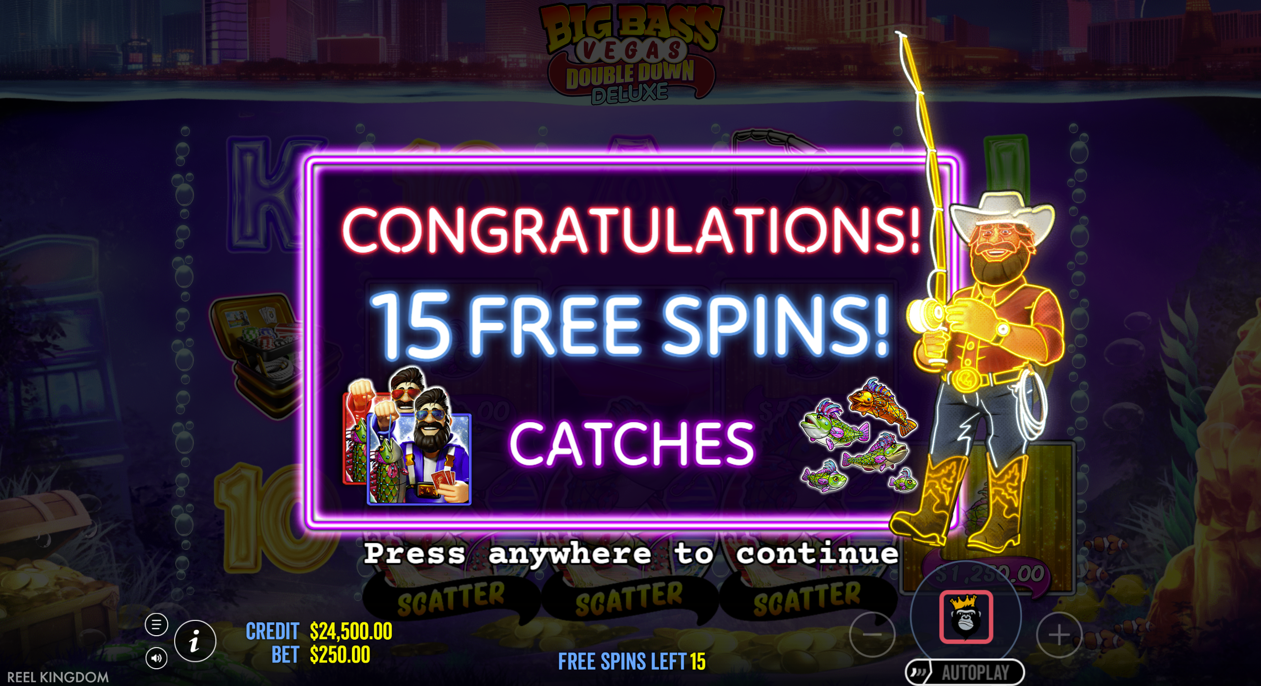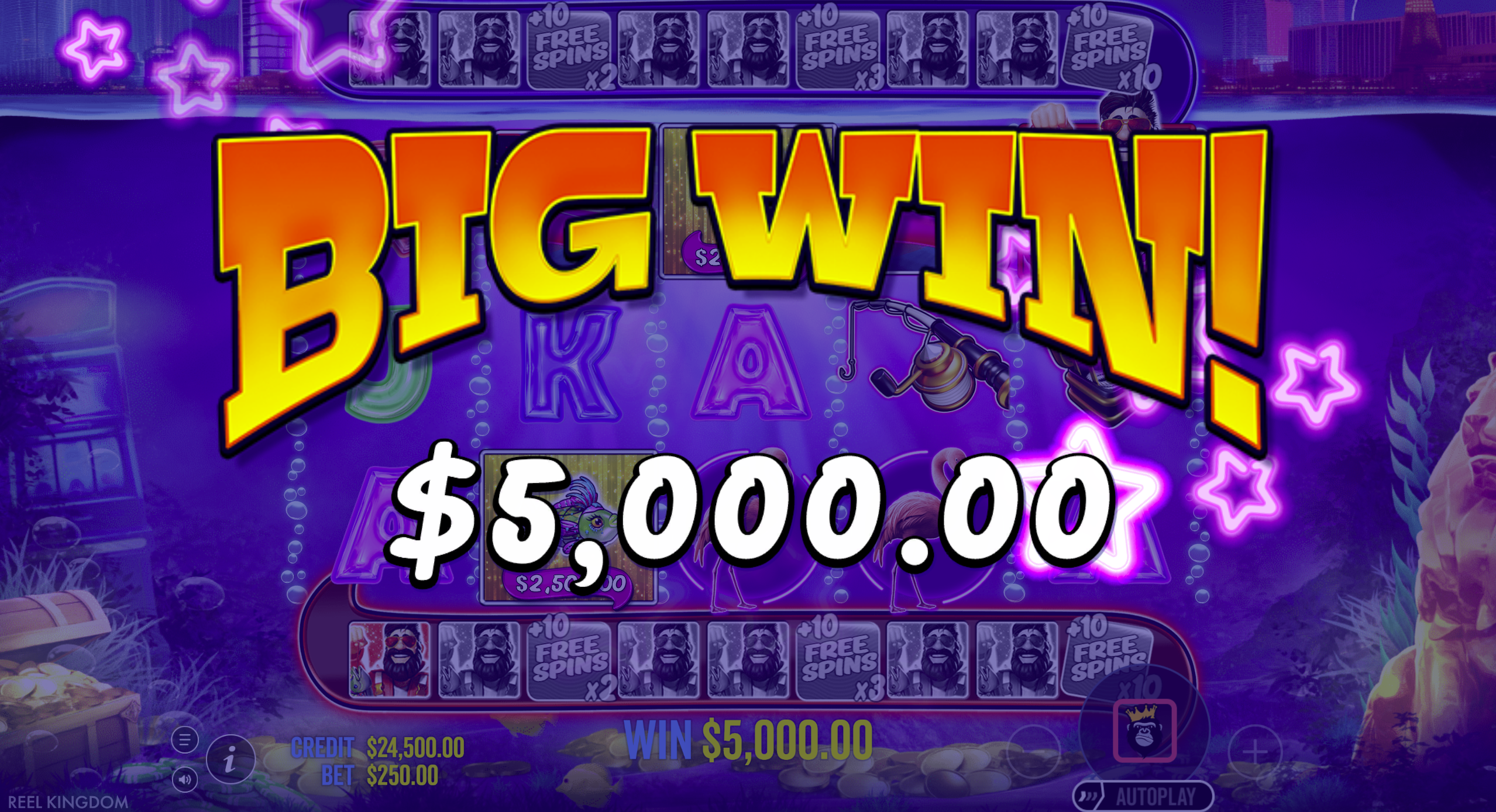 Key Bonus FeaturesPost-Collection Gamble (Double or Nothing), Free Spins with Random Starting Multiplier, Sticky Fisherman Wild in Bonus, Retriggers